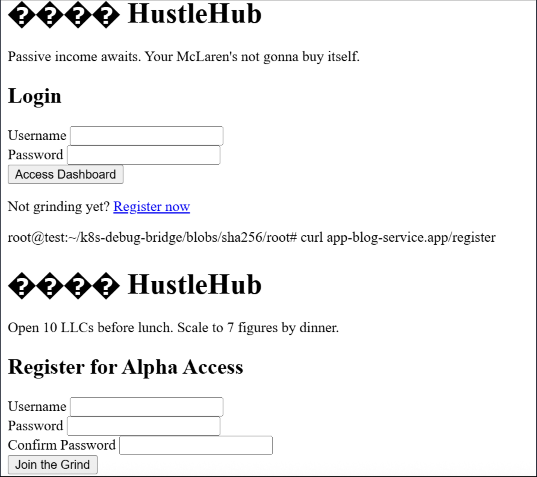 We get a response, but it looks like the service account that we end up requesting at 172.30.0.2:6443 is not able to access the application (makes sense). We do learn the name of the service account k8s-debug-bridge though, which we hadn't seen before.