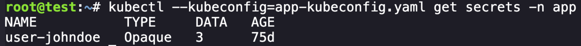 kubectl --kubeconfig=app-kubeconfig.yaml get secrets -n app -o yamlapiVersion: v1