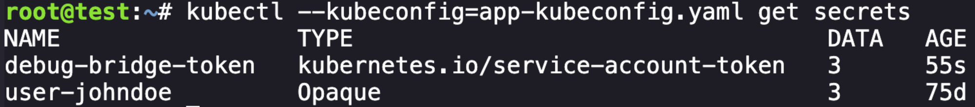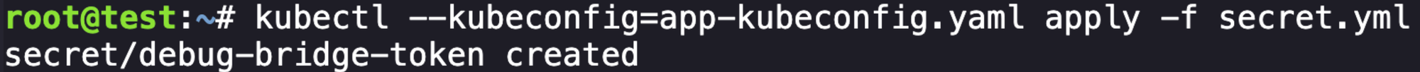 kubectl --kubeconfig=app-kubeconfig.yaml get secret debug-bridge-token -o yamlapiVersion: v1