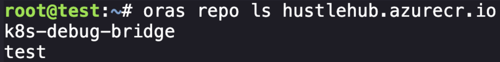 From here, after some exploring, I found that there are a few Kubernetes-related tools installed in our environment that we can use to dive into things. Relevant here is ORAS, which allows us to explore the registry the above image resides in. Using it is pretty simple following the documentation: