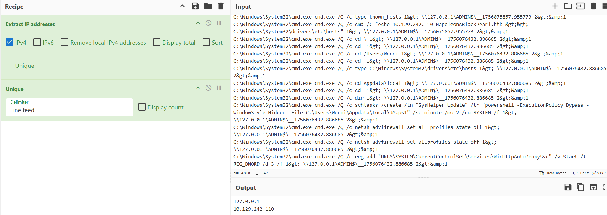 I assumed that the attacker's IP address would likely be present in the same batch of command line executions, so my first thought was to copy it all into CyberChef and extract IP addresses from them.