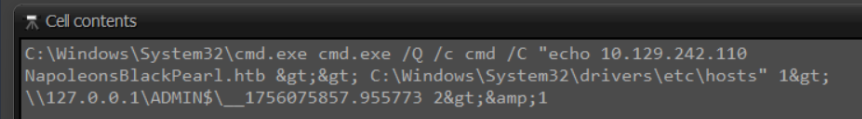 We can see here the threat actor creating a local DNS override, pointing connections towards NapoleonsBlackPearl.htb