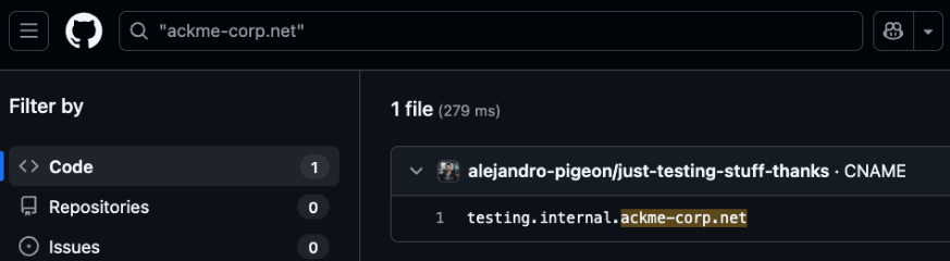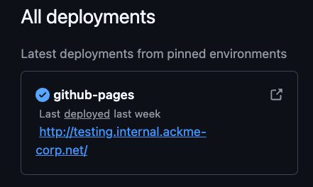 Thankfully though, earlier we saw that the current deployed GitHub pages domain was testing.internal.ackme-corp.net