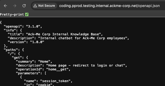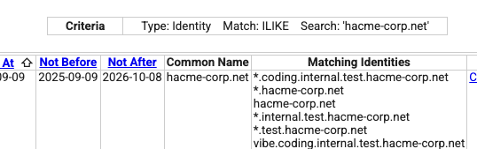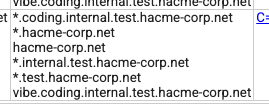 Specifically we can see the domain vibe.coding.internal.test.hacme-corp.net