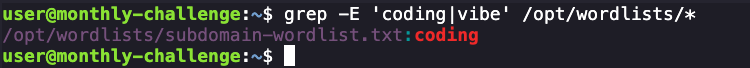 Unfortunately I received no hits. Wondering if there is any pattern matching from the original vibe/coding subdomain we saw earlier, I looked to see if either of those were present in our wordlist.