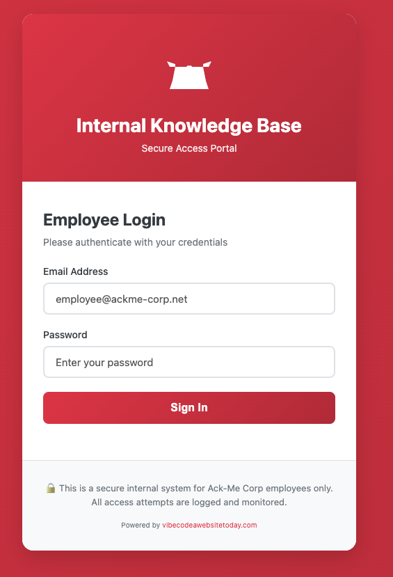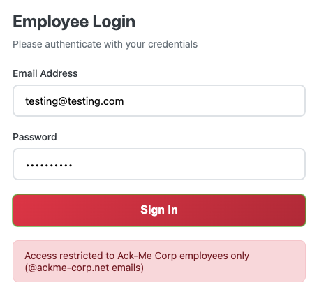 showError('Access restricted to Ack-Me Corp employees only (@ackme-corp.net emails)');
