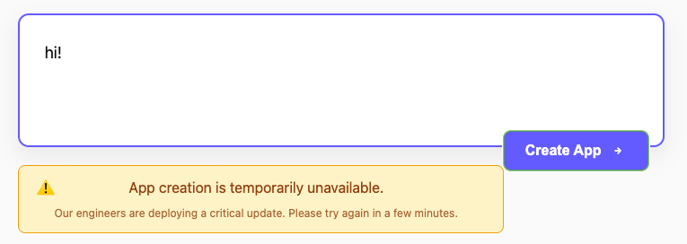 Upon inspecting the source code for the page there is no logic for any sort of API or network connections, and none of the buttons on the page actually do anything. If you type stuff into the prompt and press the Create App button, it renders you an error that is specified in the javascript: