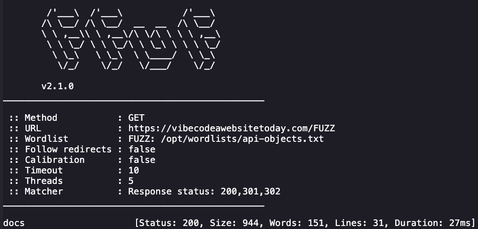 ffuf -u https://vibecodeawebsitetoday.com/FUZZ -w /opt/wordlists/api-objects.txt -mc 200,301,302 -s