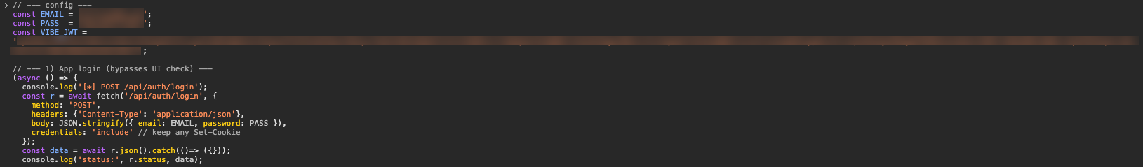 Cool so we can authenticate. Unfortunately I couldn't get any of the other endpoints to successful act that we had authenticated, so I moved to attempting to do all of this in the console of the browser to interact with the javascript directly.