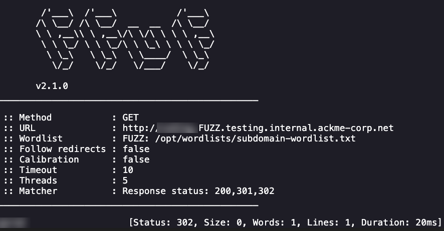 ffuf -u http://FUZZ.REDACTED.testing.internal.ackme-corp.net -w /opt/wordlists/subdomain-wordlist.txt -mc 200,301,302