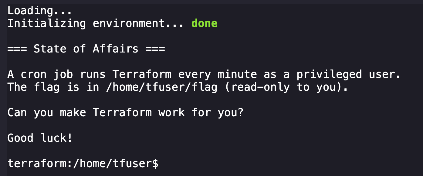 }The command here will copy the flag into /tmp for us and give everyone access. This works because the terraform automation uses a context of a user who has access to the /home/tfuser/flag file and doesn't run into the same issue we do as the ctf user.